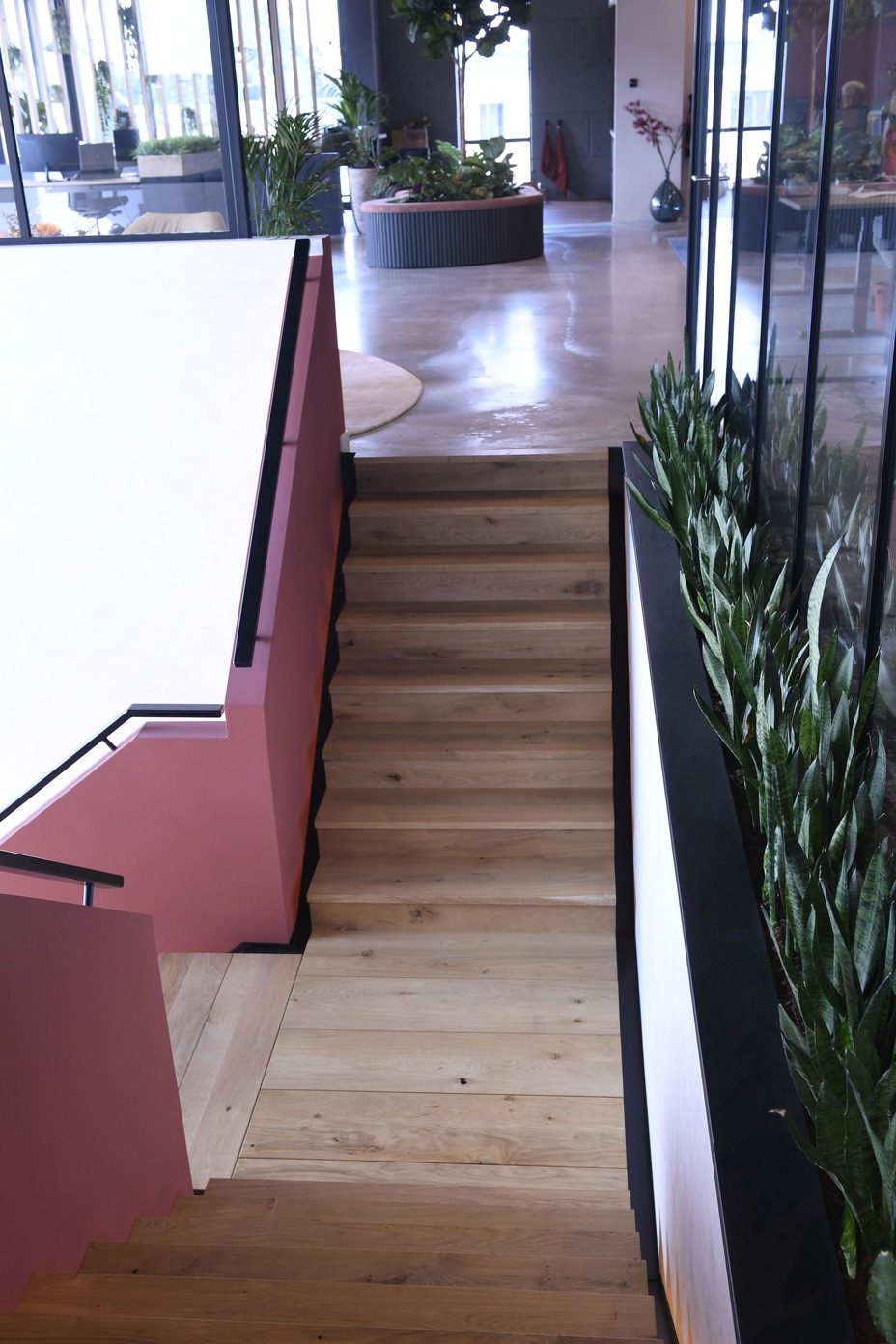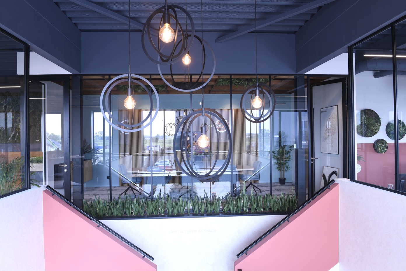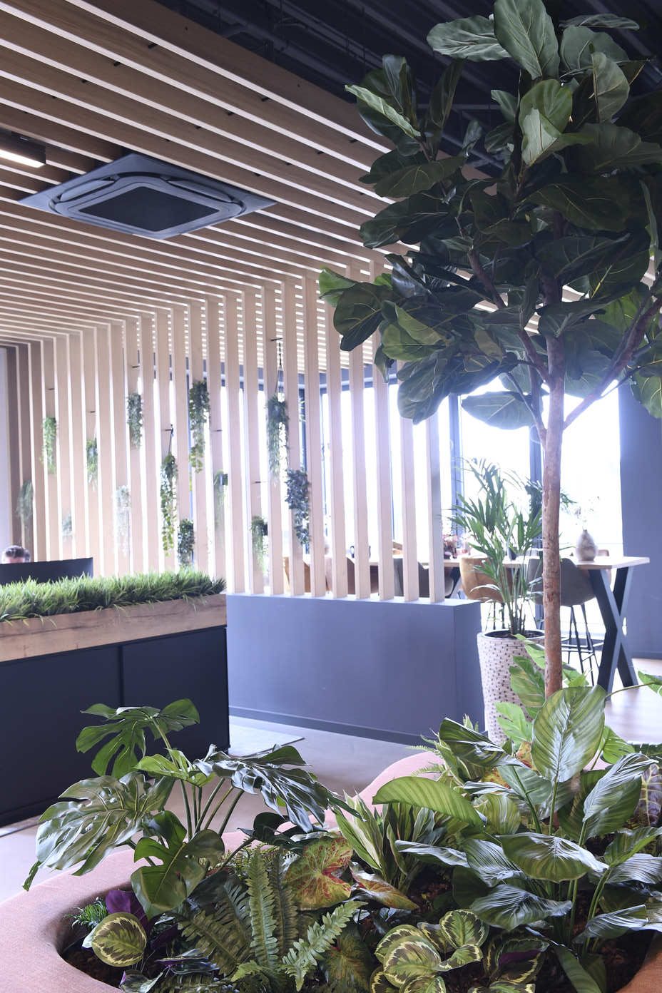 Houten plafonds, groene accenten en subtiele verlichting brengen ritme en rust, terwijl de grote tafel het hart van de ruimte vormt.