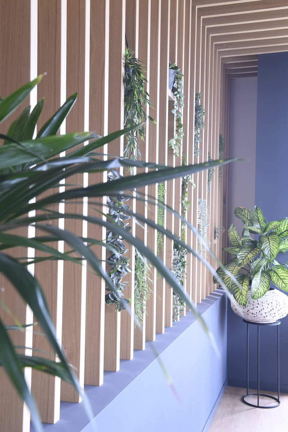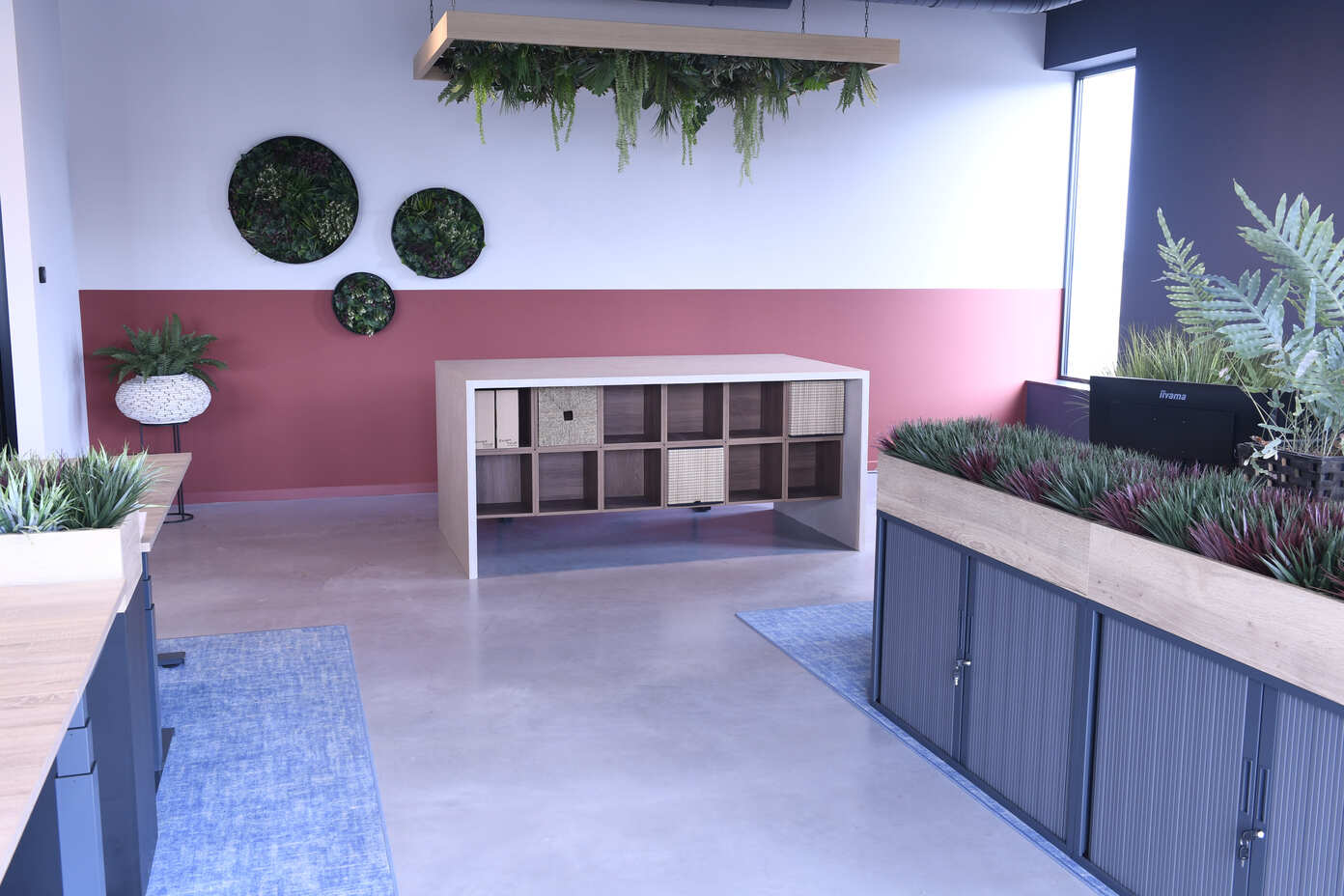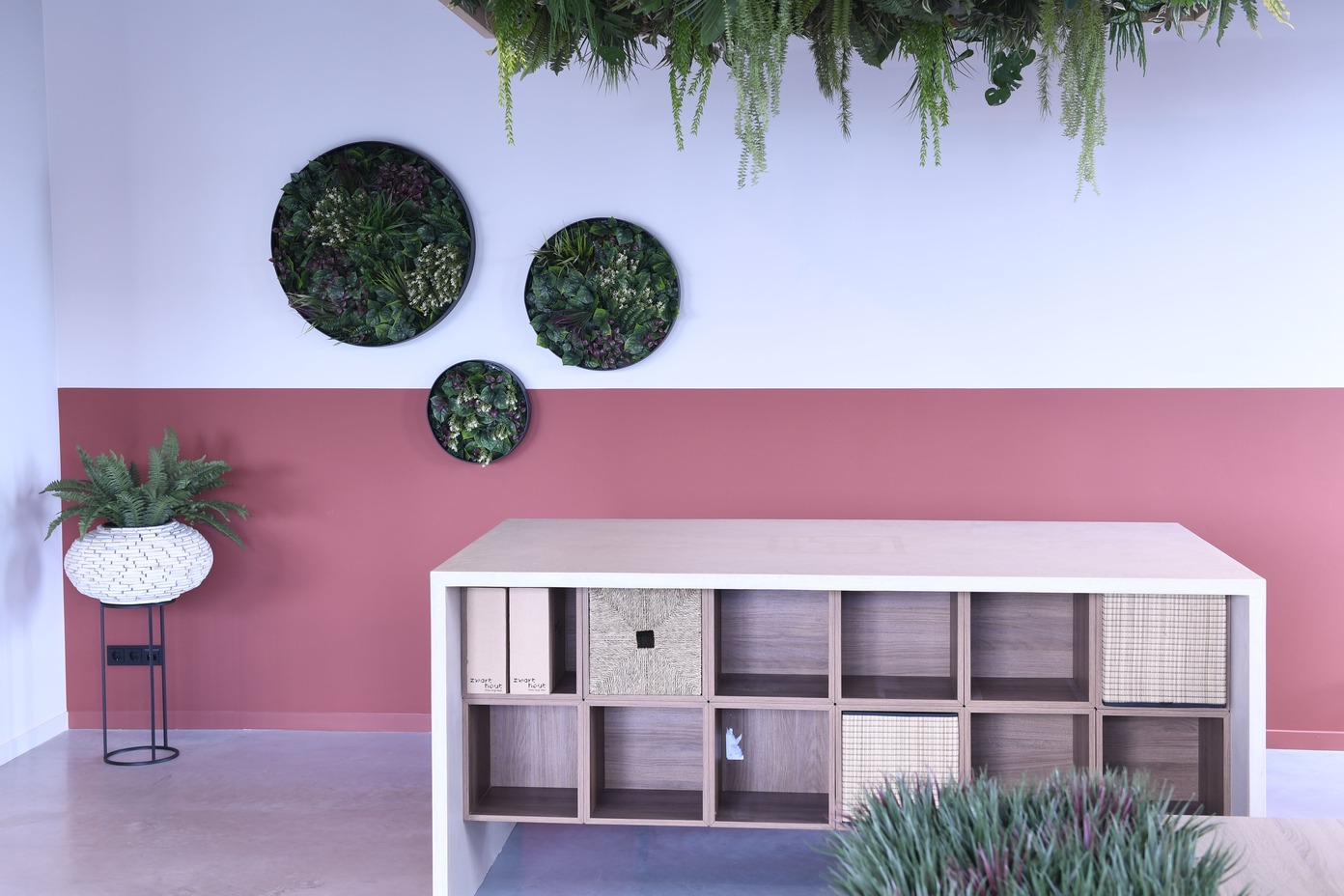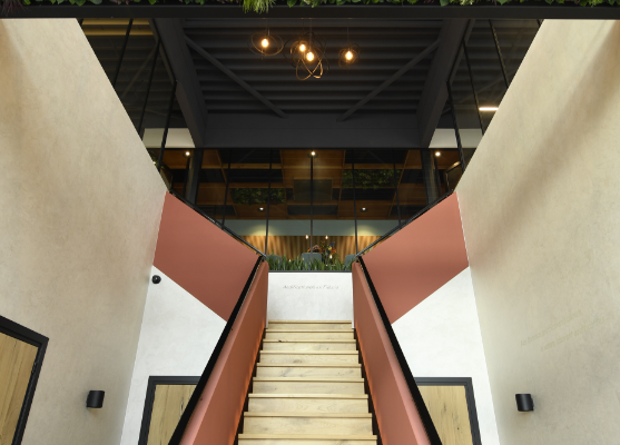 We kozen voor natuurlijke materialen en een krachtig kleurenpalet waarin rood (het fundament) en blauw (de constructie) samen het verhaal van bouwen en verbinding vertellen.